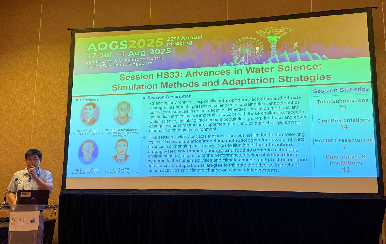 會(huì)議期間,王俊同麥吉爾大學(xué)教授阮文青云(Van-Thanh-Van Nguyen)、印度理工學(xué)院教授貝利·西瓦庫馬(Bellie Sivakumar)、南京水利科學(xué)研究院正高級(jí)工程師王小軍、香港大學(xué)副教授徐婷芳(Ting Fong May Chui)、韓國高麗大學(xué)副教授田昌炫(Changhyun Jun)等多名國際知名學(xué)者和國內(nèi)同行進(jìn)行了深入交流。繼去年在韓國平昌舉辦的AOGS 2024國際會(huì)議作口頭報(bào)告“基于概率解析法的氣候變化對(duì)城市雨水收集系統(tǒng)水文效能影響評(píng)估研究(Assessing the Impacts of Climate Change on Urban Rainwater Harvesting Systems’ Hydrologic Performance Using an Analytical Probabilistic Approach)”后,此次參會(huì)和學(xué)術(shù)交流對(duì)于提升學(xué)院水利學(xué)科的國際聲譽(yù)與影響力具有重要意義。