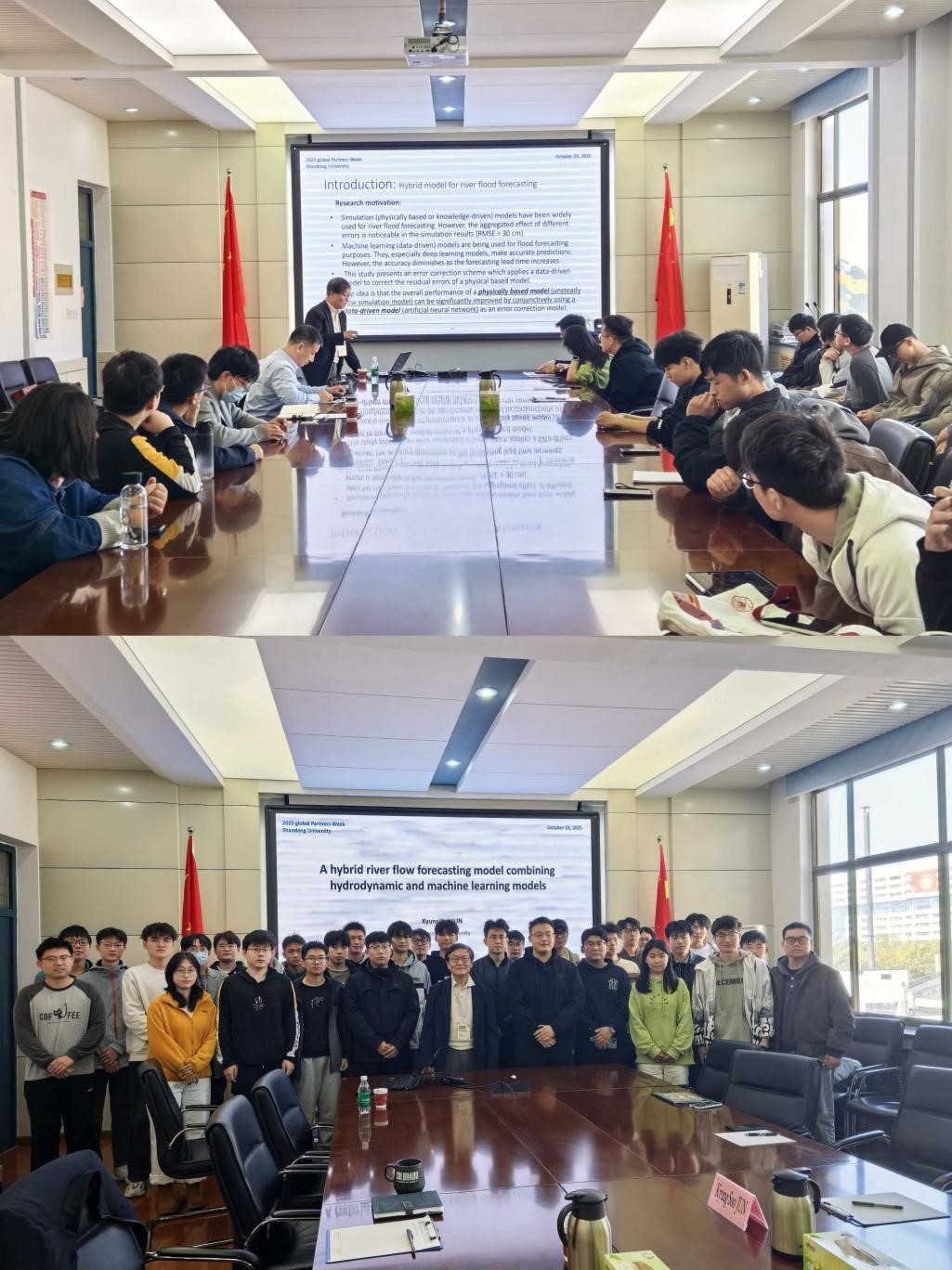 10月29日上午,成均館大學水資源研究生院院長田庚秀(Kyung Soo JUN)赴學院開展學術研討,副院長毛德強主持報告并致辭。田教授發(fā)表題為“A hybrid river flow forecasting model combining hydrodynamic and machine learning models”的報告,提出一種基于水動力模型優(yōu)化與誤差校正建模相結(jié)合的混合方法,通過綜合利用物理系統(tǒng)的不同特征來提高洪水水位預報精度。現(xiàn)場共計30余位學生參與,師生積極互動交流。