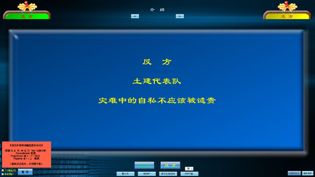 下午2點(diǎn),短暫適應(yīng)了網(wǎng)上辯論環(huán)境與操作系統(tǒng)后,辯論賽正式開始。首先由正方一辯進(jìn)行開題陳詞。正方先聲奪人,從定義出發(fā),人類行為分為“自私行為”“正常行為”“無私行為”三種,為接下來的論辯打下基礎(chǔ)。反方則在道德層次立意,強(qiáng)調(diào)在災(zāi)難這一特殊情景中,人類展現(xiàn)出的更多是求生欲望與生物本能,若站在道德高地上加以譴責(zé),則不免有求全責(zé)備之嫌。