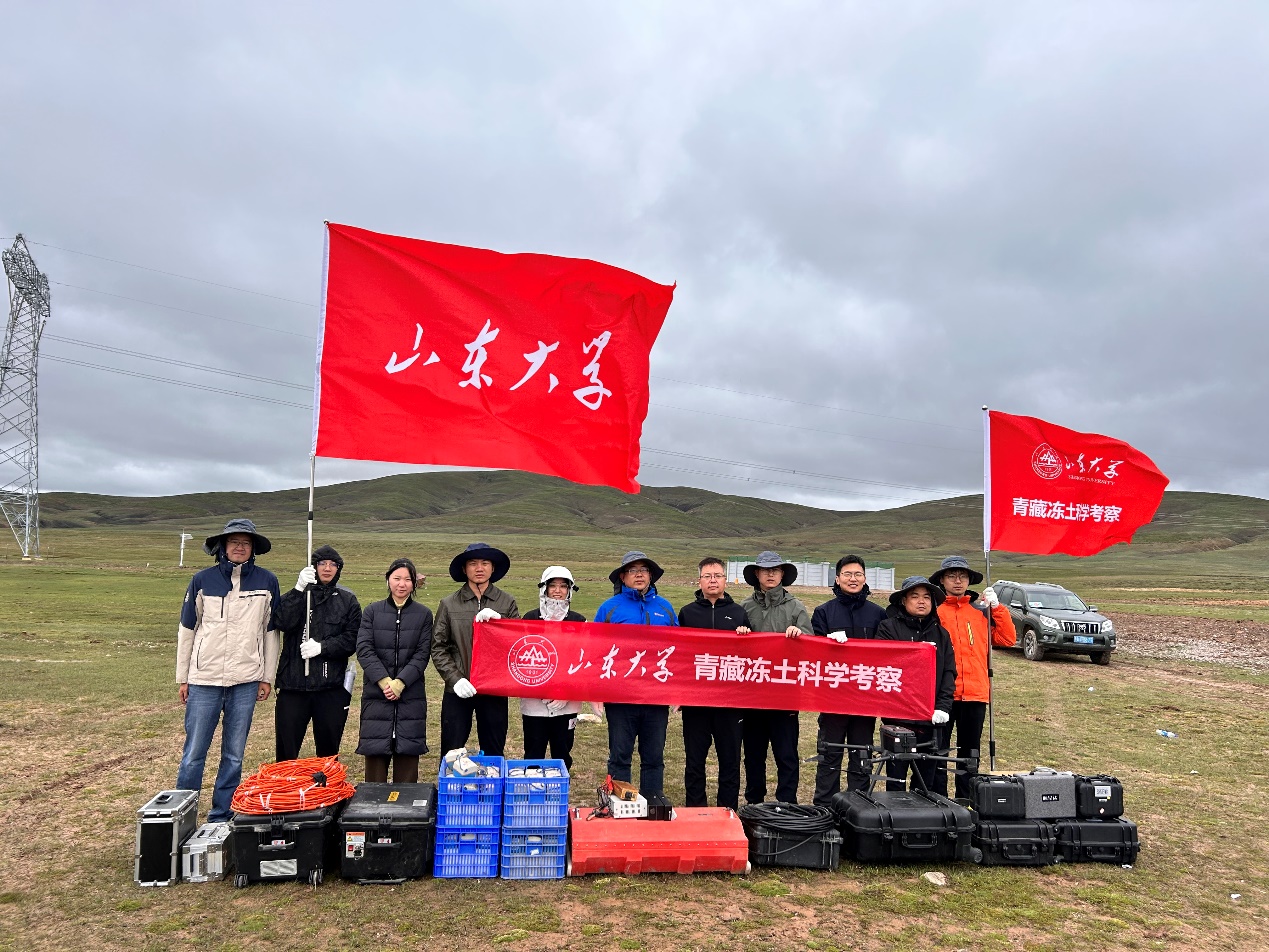 隨著全球氣候變暖的加劇,青藏高原多年凍土退化日益嚴重,本次凍土科學考察主要在沱沱河段典型區(qū)域開展淺地表凍土物性特征和溫度場分布探測,以獲得多年凍土特征。在海拔4700m的區(qū)域,科考隊采用地質(zhì)雷達、高密度電法等方法進行了現(xiàn)場試驗數(shù)據(jù)采集。在雪域高原上,科考隊師生面對高寒、缺氧、氣候惡劣等困難,發(fā)揚“缺氧氣不缺志氣,海拔高斗志更高”的精神,在海拔4700米的試驗現(xiàn)場樹立起了山東大學的旗幟,超額完成預期工作目標,獲取了寶貴的第一手資料,為多年凍土區(qū)研究工作的有序開展奠定了堅實基礎。