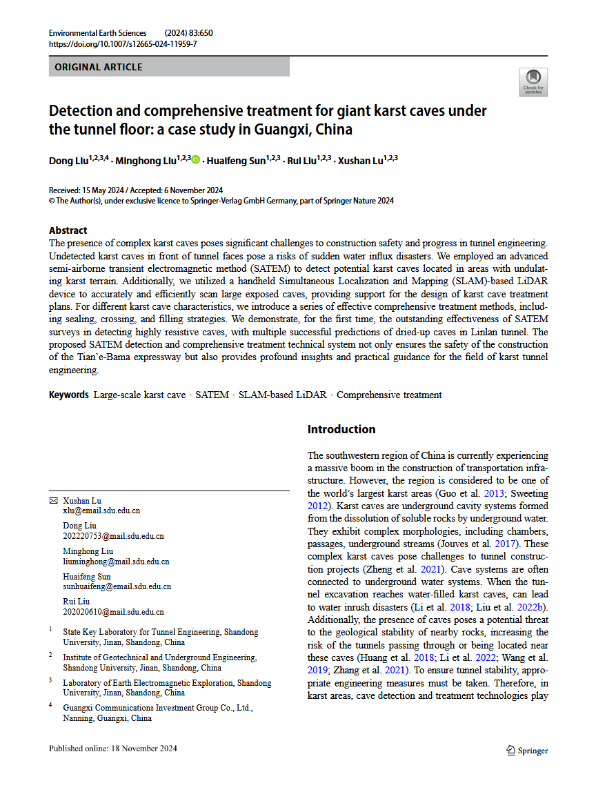 近日,土建與水利學(xué)院巖土工程系孫懷鳳教授課題組在地球科學(xué)領(lǐng)域著名期刊《Environmental Earth Sciences》(影響因子2.8,JCR分區(qū)為Q2)上發(fā)表研究成果:Detection and comprehensive treatment for giant karst caves under the tunnel floor: a case study in Guangxi, China。博士研究生劉東為第一作者,博士研究生劉明宏為第二作者,巖土工程系副研究員盧緒山為通訊作者。該論文得到了廣西重點(diǎn)科技發(fā)展計(jì)劃項(xiàng)目、國(guó)家自然科學(xué)基金項(xiàng)目和泰山學(xué)者獎(jiǎng)勵(lì)計(jì)劃共同資助。