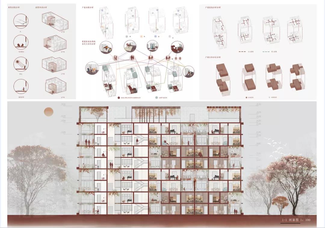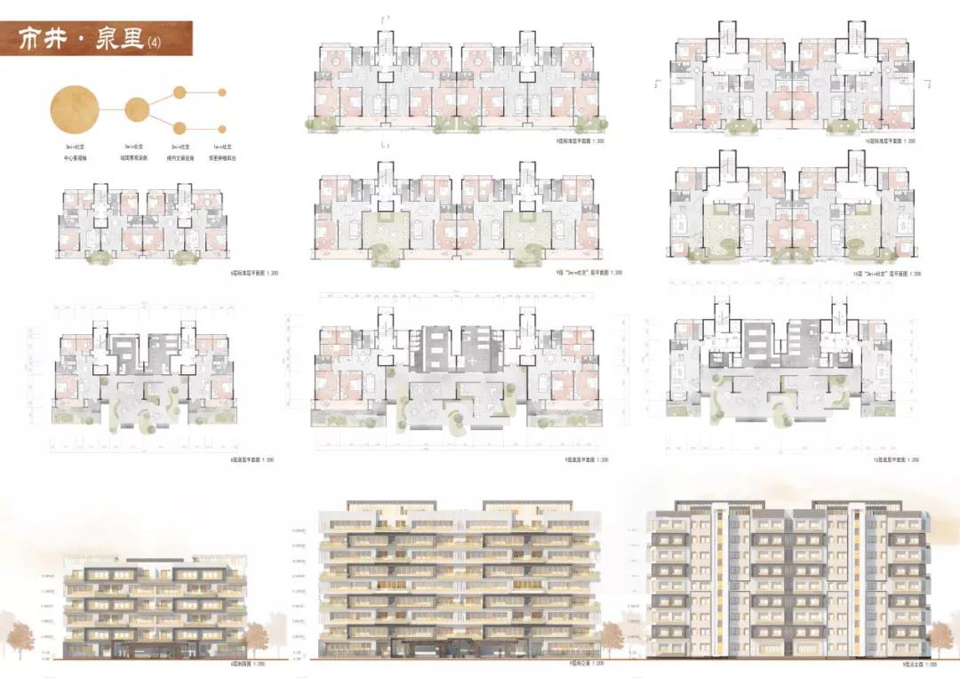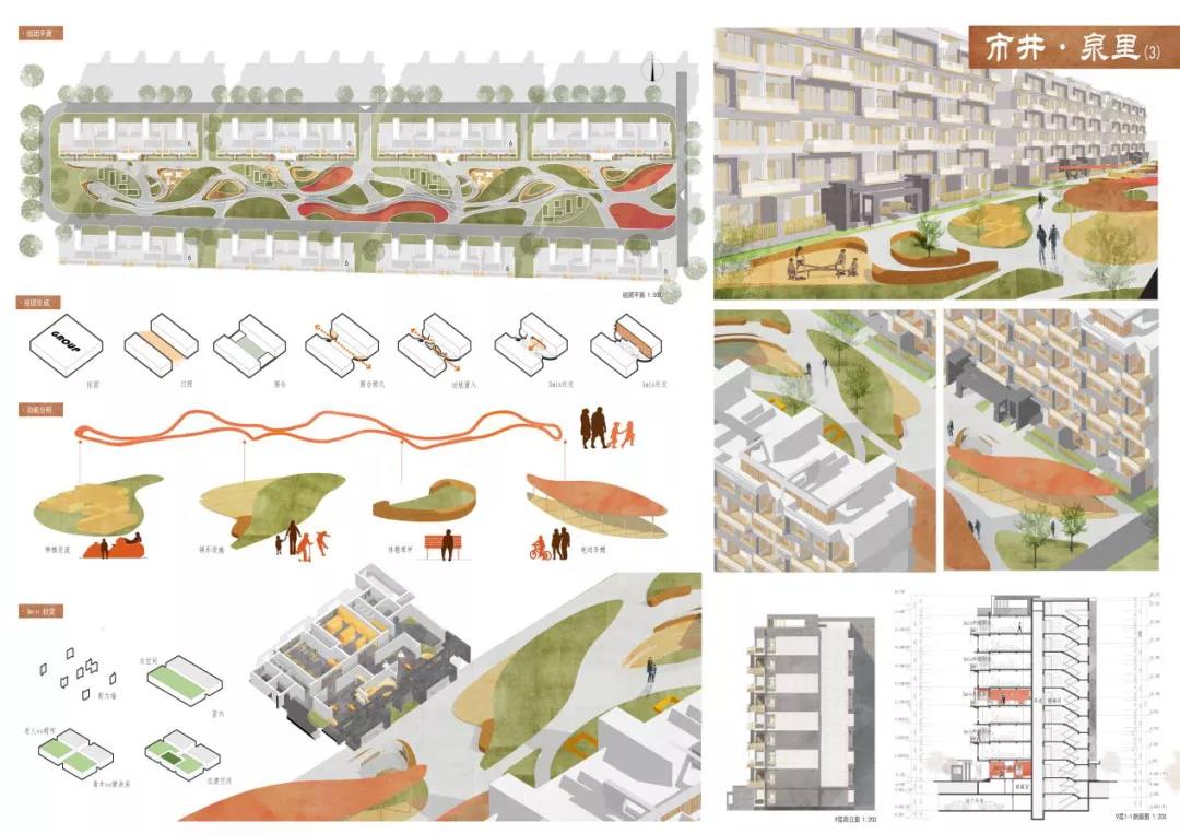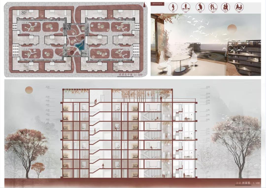 該設(shè)計通過引入以曲水亭街為原型的“市井”與“泉水”、功能與環(huán)境并置的的空間組織方式,試圖形成全齡有效的公共社交活動空間;并分級形成完善的“核心與網(wǎng)點(diǎn)”社交體系,即社區(qū)級(5min/中心景觀軸+社區(qū)商業(yè))、組團(tuán)級(3min/漫游休憩+便民設(shè)施)、單元級(2min/層間共享書屋)、鄰里級(1min/鄰戶共享種植陽臺),最終復(fù)原老濟(jì)南“功能有效、年齡并置、自然共生”的傳統(tǒng)社交氛圍。