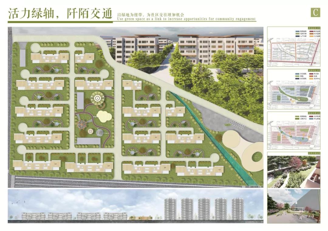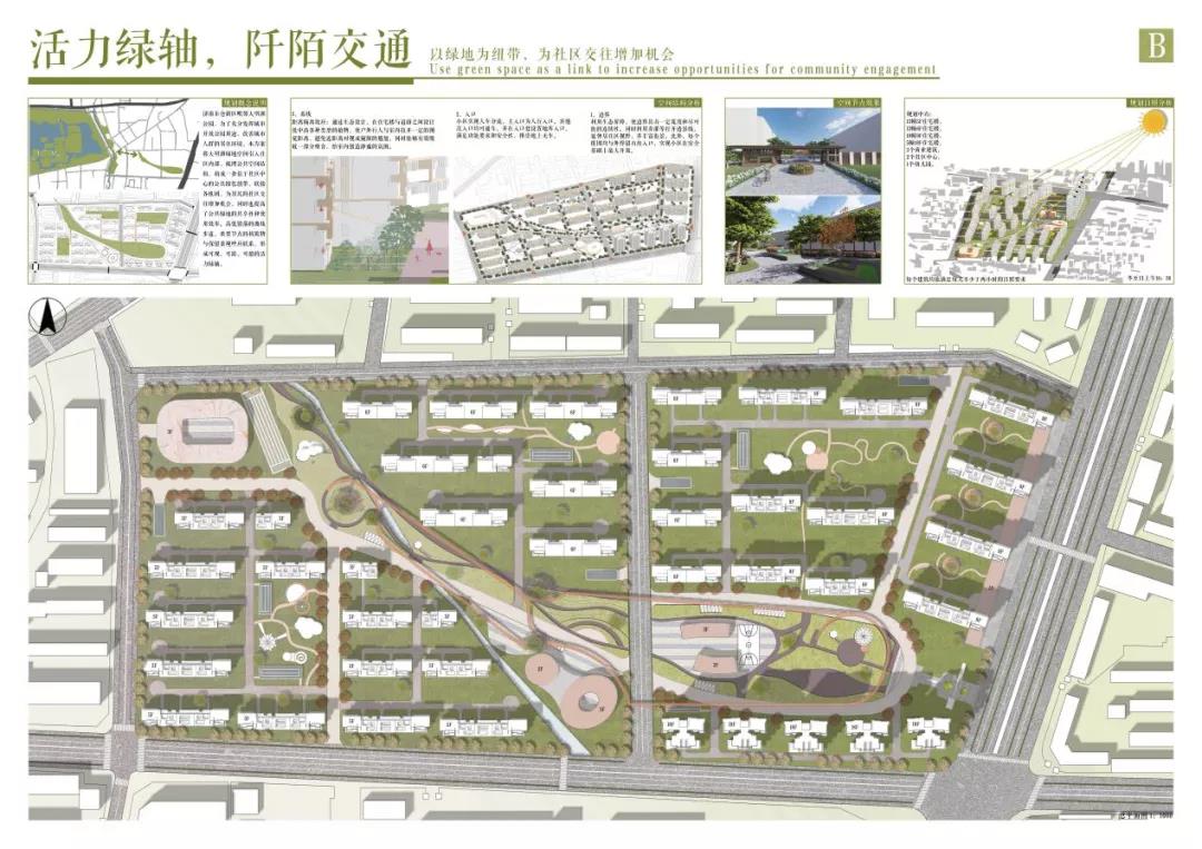印楠的作品設(shè)計的概念是以綠地為紐帶,為社區(qū)交往增加機(jī)會。濟(jì)南東倉新區(qū)毗鄰大明湖公園,為了充分發(fā)揮城市開放公園用途,改善城市人群的居住環(huán)境,本方案將大明湖綠地空間引入住區(qū)內(nèi)部,梳理公共空間結(jié)構(gòu),構(gòu)成一條位于社區(qū)中心的公共綠色紐帶,聯(lián)接各組團(tuán),為居民的社區(qū)交往增加機(jī)會,同時也提高了公共綠地的共享性和使用效率。