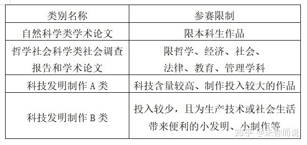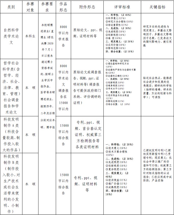 參賽作品分為三大類:自然科學(xué)類學(xué)術(shù)論文、哲學(xué)社會(huì)科學(xué)類(含哲學(xué)、經(jīng)濟(jì)、社會(huì)、法律、教育、管理)社會(huì)調(diào)查報(bào)告和學(xué)術(shù)論文、科技發(fā)明制作。