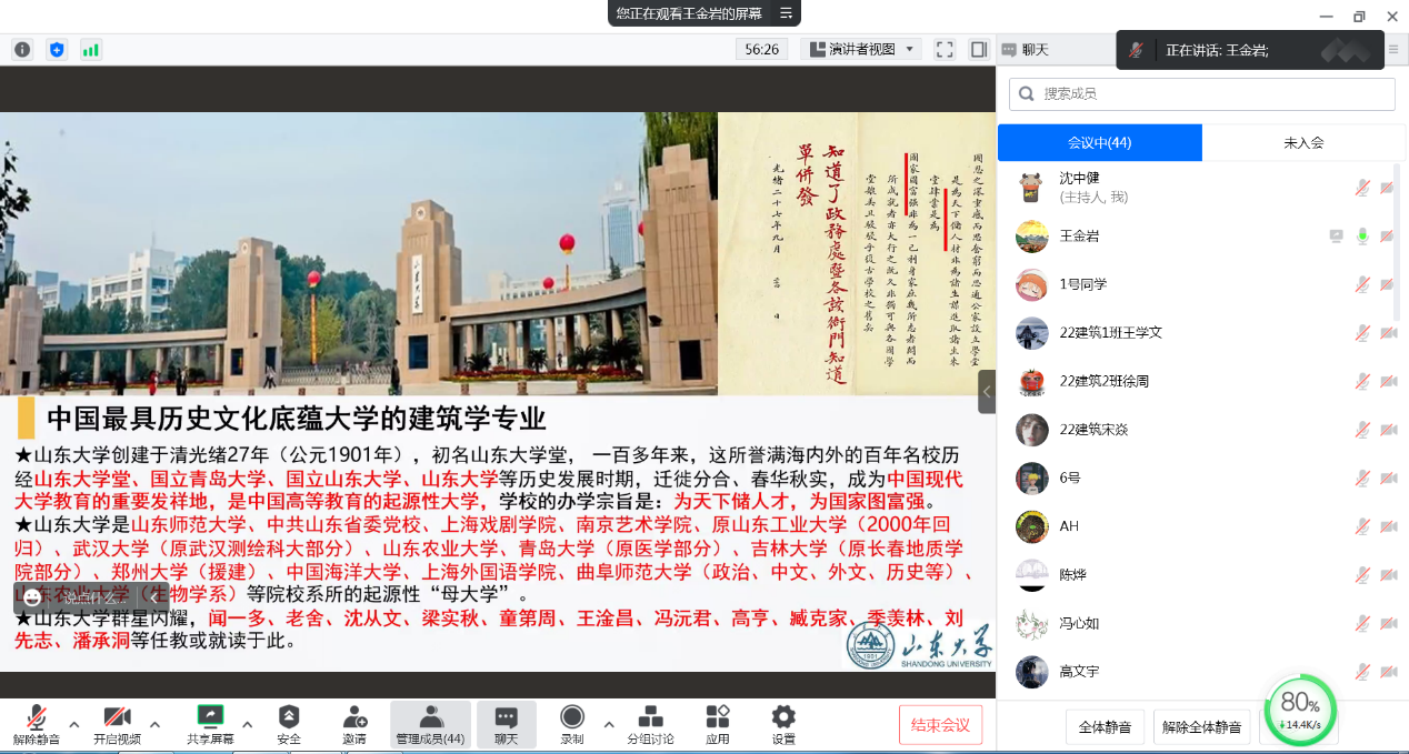 黨支部書(shū)記王金巖首先系統(tǒng)介紹了山東大學(xué)土建與水利學(xué)院建筑學(xué)系的基本情況,展示了山東大學(xué)土建與水利學(xué)院建筑學(xué)系對(duì)“探索式”原創(chuàng)基礎(chǔ)理論和“合作式”理論及建筑設(shè)計(jì)實(shí)踐的不斷創(chuàng)新,對(duì)現(xiàn)代化教學(xué)方法和發(fā)展定位的不斷探索。同時(shí)也闡釋了建筑學(xué)是一門(mén)包羅萬(wàn)象,可與哲學(xué)、歷史、數(shù)學(xué)、工程、文化、藝術(shù)等多個(gè)學(xué)科交叉融合的綜合性學(xué)科。