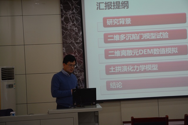 在報告中,芮瑞教授首先簡要解釋了成拱現(xiàn)象、土工效應(yīng)及樁承式路堤等概念,接著介紹了二維多沉陷門模型試驗(yàn)。隨后,芮瑞教授講解了二維離散元DEM數(shù)值模擬,指出DEM模擬結(jié)果與模型試驗(yàn)結(jié)果相吻合,證明了試驗(yàn)和模擬的可靠性,在此基礎(chǔ)上分析土拱演化的力學(xué)模型。最后,芮瑞教授向大家闡述了土拱演化的兩層含義。