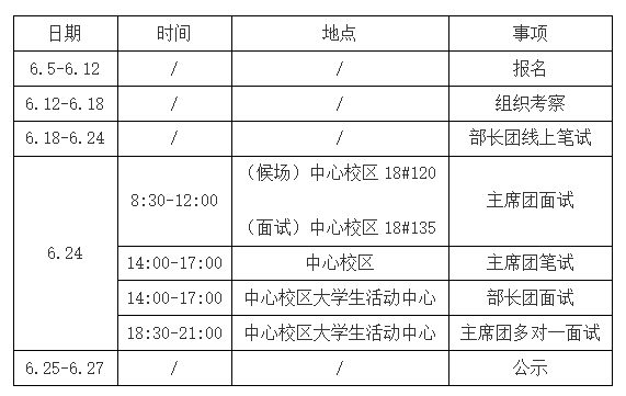 部長(zhǎng)團(tuán):包括個(gè)人演講和答辯兩個(gè)部分,兩部分各均不超過四分鐘,不使用PPT、視頻等多媒體輔助。請(qǐng)參加競(jìng)職面試的同學(xué)至少提前20分鐘到達(dá)指定區(qū)域簽到候場(chǎng)。