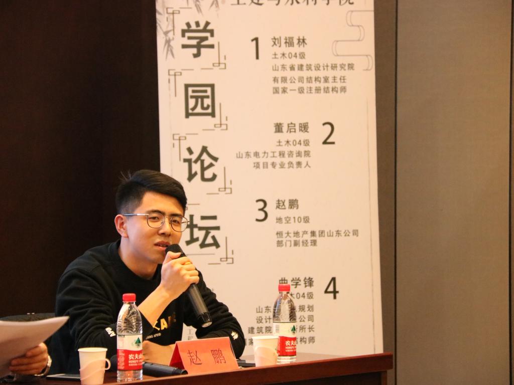各位嘉賓對土木專業(yè)就業(yè)方向特點、個人就業(yè)經(jīng)歷、大學期間能力積累等多方面進行了介紹。山東省建筑設(shè)計研究院有限公司結(jié)構(gòu)室主任劉福林從橫向和縱向區(qū)分了土木工程,點出土木工程就業(yè)面廣的特點;山東省電力工程咨詢院項目專業(yè)負責人董啟暖鼓勵同學們在大學期間不負青春,努力學習,注重提升綜合素養(yǎng);山東省郵電規(guī)劃設(shè)計院有限公司建筑院建筑所所長曲學鋒提出,甲方、設(shè)計院、造價、施工單位等行業(yè)各有特點,同學們需要找到與自身素質(zhì)相匹配的方向與崗位;山東華維工程咨詢有限公司副總周亞旭對就業(yè)方向進行了推薦,鼓勵大家不要故步自封于本專業(yè)相關(guān)領(lǐng)域,要學會抓住發(fā)展機遇,認真對待每一份工作,積累經(jīng)驗,厚積薄發(fā);恒大地產(chǎn)集團山東公司部門副經(jīng)理趙鵬對房地產(chǎn)公司的運營模式做了詳細解釋。房地產(chǎn)領(lǐng)域人力資源較為密集,土木工程專業(yè)可選部門較多。