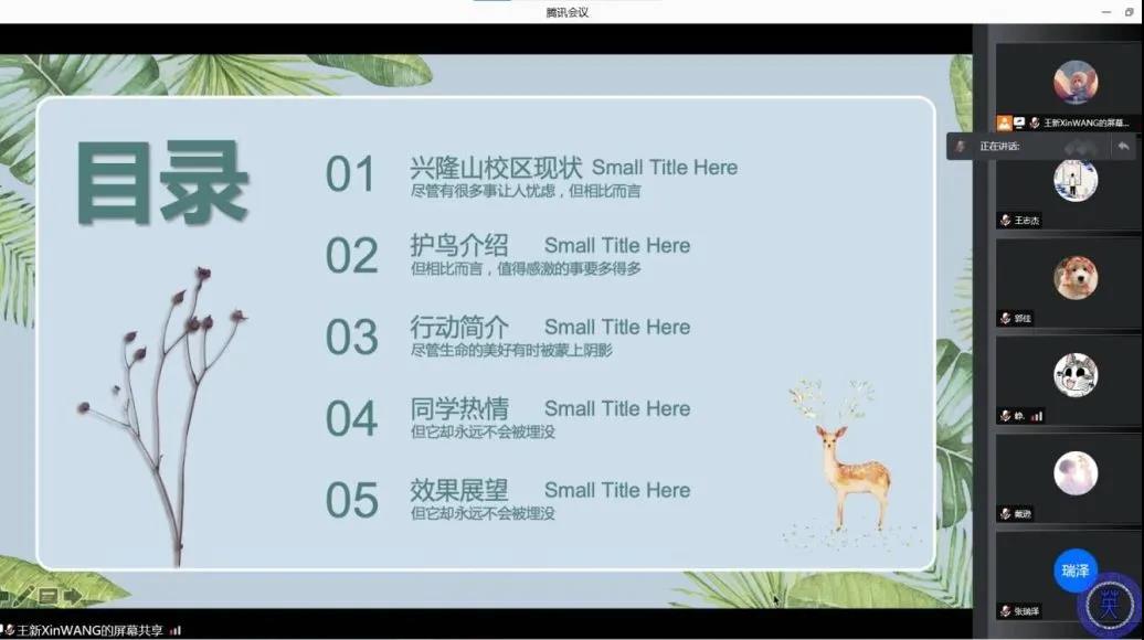 本次討論會議,部署了后續(xù)的工作,充分調(diào)動起了同學(xué)們的積極性。相信大家會盡快落實行動,保護校園中的鳥類,實現(xiàn)人類與鳥類的和諧共處。