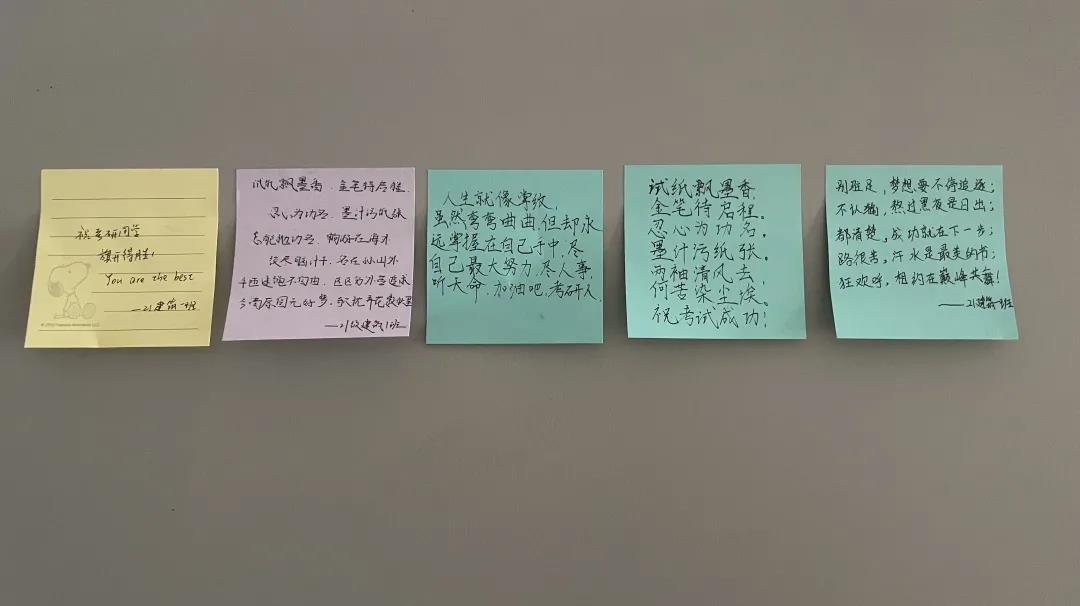 對(duì)考研學(xué)子的祝福不僅僅流于紙面,建筑學(xué)系的同學(xué)還找到了身邊幾位正在備戰(zhàn)考研的學(xué)長(zhǎng),親手將明信片交給他們,并和他們擁抱。同學(xué)們一致認(rèn)為,口頭語(yǔ)言的表達(dá)以及肢體上的祝福相比紙面文字更加直接有效,更能夠傳達(dá)同學(xué)們的美好祝愿。