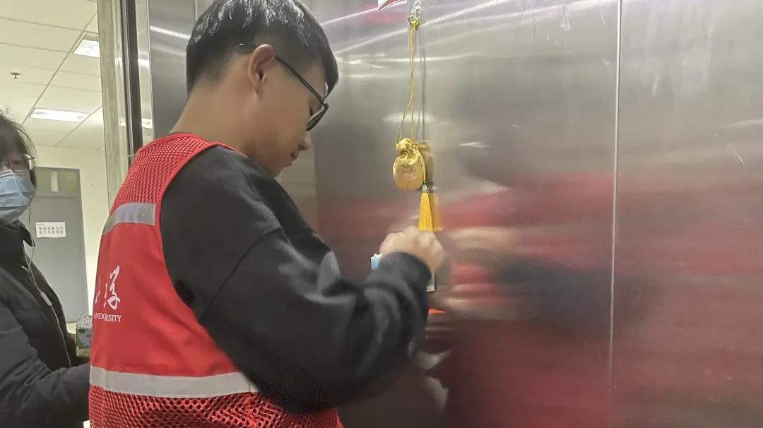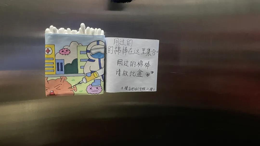 在與物業(yè)管理人員聯(lián)系溝通后,同學(xué)們將前期準(zhǔn)備好的棉簽盒安放在興隆山教學(xué)樓的三個(gè)電梯內(nèi)。同學(xué)們首先考察了電梯的內(nèi)部空間,選擇合適位置放置棉簽盒,并放入了棉簽。棉簽盒的安裝選取了合適的高度以及美觀的間隔空間,使安裝方式實(shí)現(xiàn)了適用性和藝術(shù)性的統(tǒng)一。