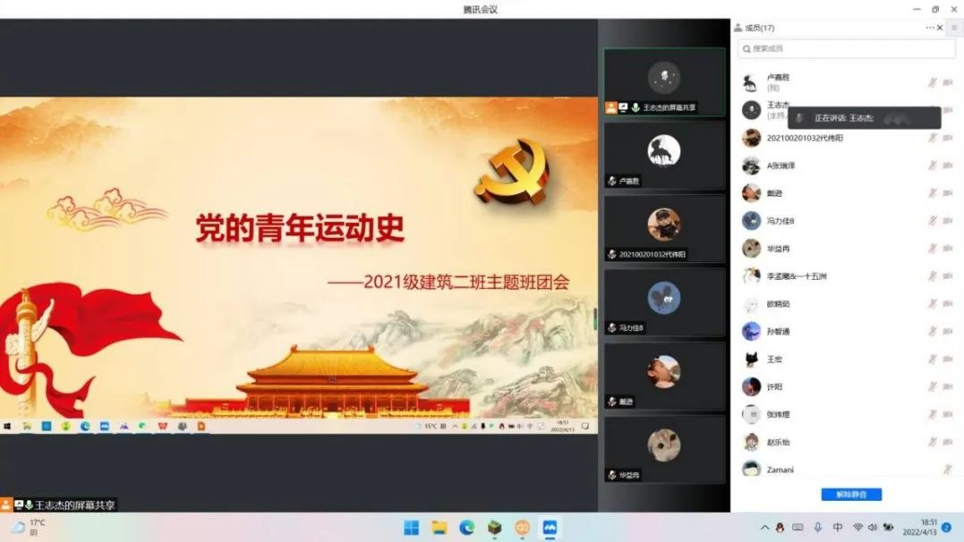 近日,2021級建筑系二班于線上召開本學期第一次主題團會,團支書王志杰主持,全體同學參加。團會以學習黨的青年運動史為主題,進行深刻的分析與反思,有助于同學們對黨有更為深刻的認識,激發(fā)新時代中國青年應有的責任與擔當,增強了同學們對黨和國家的認同與擁護。