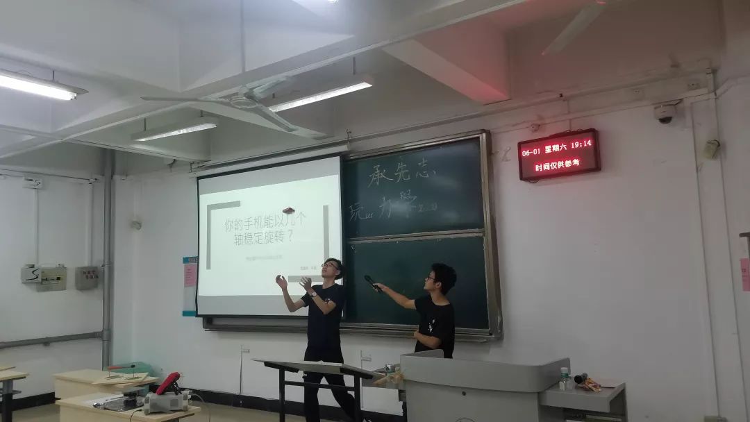 講座伊始,李熠與黃耀昕分享了對手機(jī)繞軸旋轉(zhuǎn)問題的研究。他們在調(diào)查中發(fā)現(xiàn),目前網(wǎng)絡(luò)上尚未出現(xiàn)這方面的權(quán)威解釋,通過周密的分析與思考,兩位同學(xué)給出了自己的解答,并向大家展示了自己的分析與計算過程。主講人李浩隆則借助儀器演示了“克拉尼圖形”的形成。演示完成后,王少偉進(jìn)行了點評,并為同學(xué)們深入講解了其中的原理。實驗后,李浩隆又帶領(lǐng)大家完成了“乒乓陀螺”、 ““聲音變圖案”、“鋼珠噴泉”等幾個有趣的力學(xué)實驗。