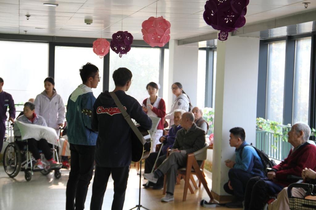 隨后,同學們按照分工開展相應(yīng)的志愿活動,為每個房間的老人送出新鮮水果和親手制作的紙花球、小天鵝,并與老人聊天、了解他們的生活,與老人一起唱紅歌……一個個暖心的活動,既傳達了同學們的志愿熱情,又傳遞了同學們對老人的關(guān)心與祝福。隨后,大家現(xiàn)場表演了精心排練的節(jié)目,吉他、新疆舞、合唱等節(jié)目都獲得了陣陣掌聲。在場的老人觀看同學們的表演,與同學們聊天,度過了一段美好的時光。