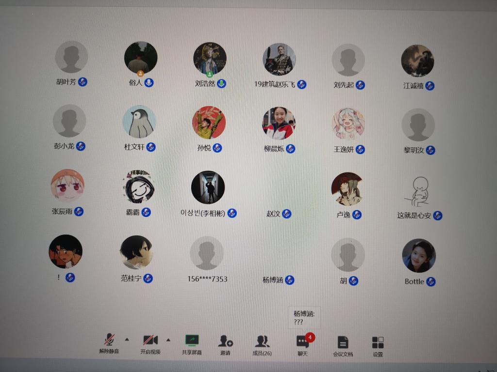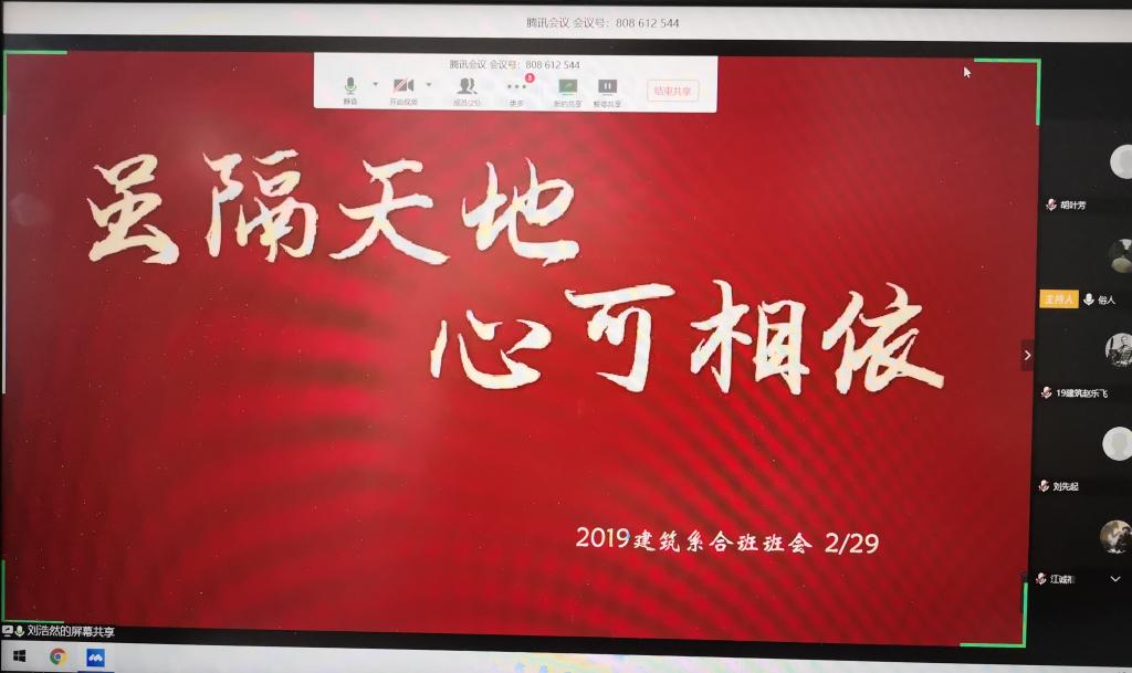 早上10點,會議正式開始。會議伊始,劉浩然播放了疫情期間健康生活的教育短片,提醒大家堅持鍛煉身體,保持良好的作息習(xí)慣,認真對待學(xué)習(xí)。隨后,劉浩然和李特針對疫情普及了一些健康生活習(xí)慣,著重提醒大家居家要保持通風(fēng),保持衛(wèi)生,增強體質(zhì),勤加洗手。建筑二班心理委員胡舜凡給同學(xué)們普及了一些疫情可能會造成的不良心理影響,并就這一問題進行了深入探討,引導(dǎo)大家正確認識此次疫情,他表示會隨時關(guān)心同學(xué)們的心理動態(tài),防止同學(xué)們因疫情產(chǎn)生心理上的負擔(dān)。建筑一班學(xué)習(xí)委員徐巍珂就疫情期間的課程安排做了詳細介紹,針對同學(xué)們可能會遇到的學(xué)習(xí)問題進行了羅列并提出解決問題的建議,同時督促同學(xué)們認真學(xué)習(xí),積極完成各項學(xué)習(xí)任務(wù)。會議最后,同學(xué)們共同表示了“希望疫情早日結(jié)束,我們可以重回校園,共賞明媚春光”的美好心愿。