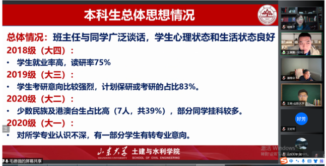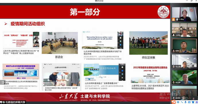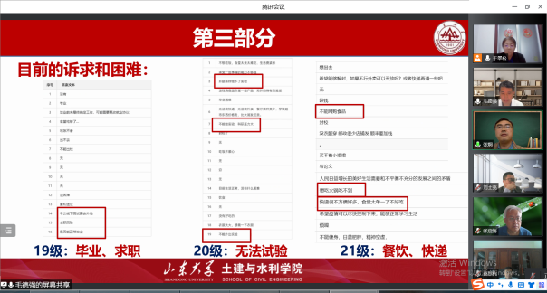 交流過程中,水工系毛德強(qiáng)、王冀鵬、張炯、于翠松還結(jié)合近期疫情防控分別匯報(bào)了校內(nèi)教師工作生活情況、教學(xué)科研開展情況、本科生和研究生思想動(dòng)態(tài)及學(xué)習(xí)生活情況、校外教師日常管理、支部共建以及“我為學(xué)生辦實(shí)事”等相關(guān)工作。